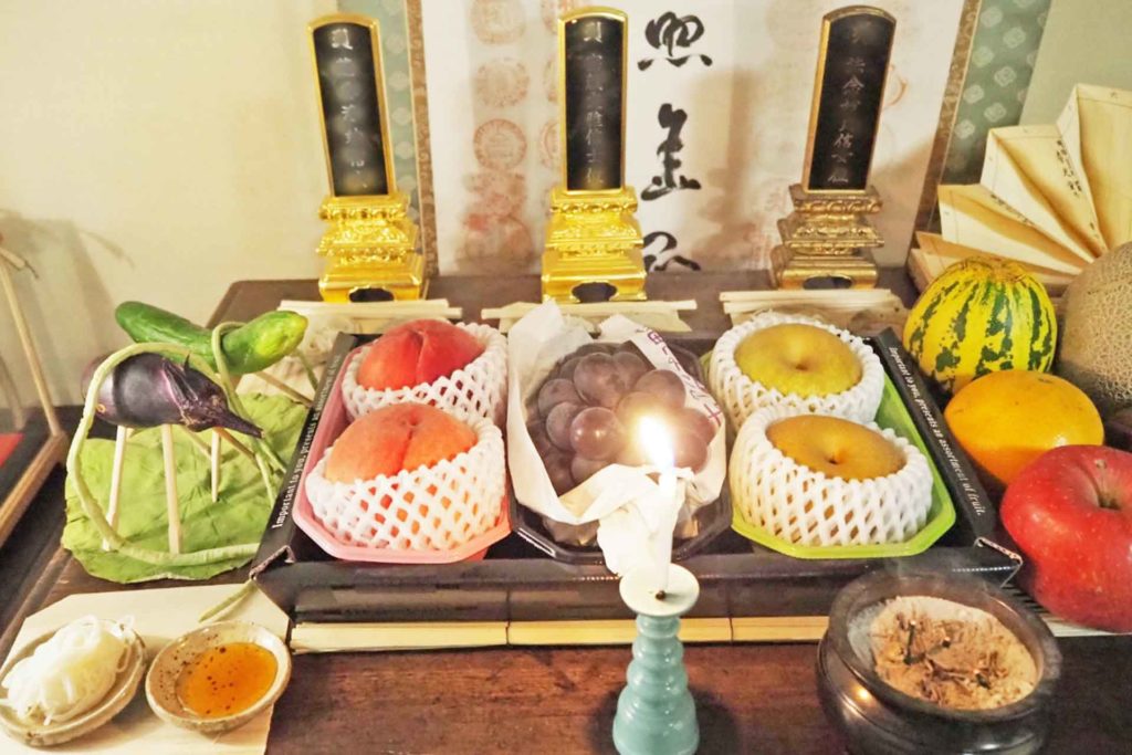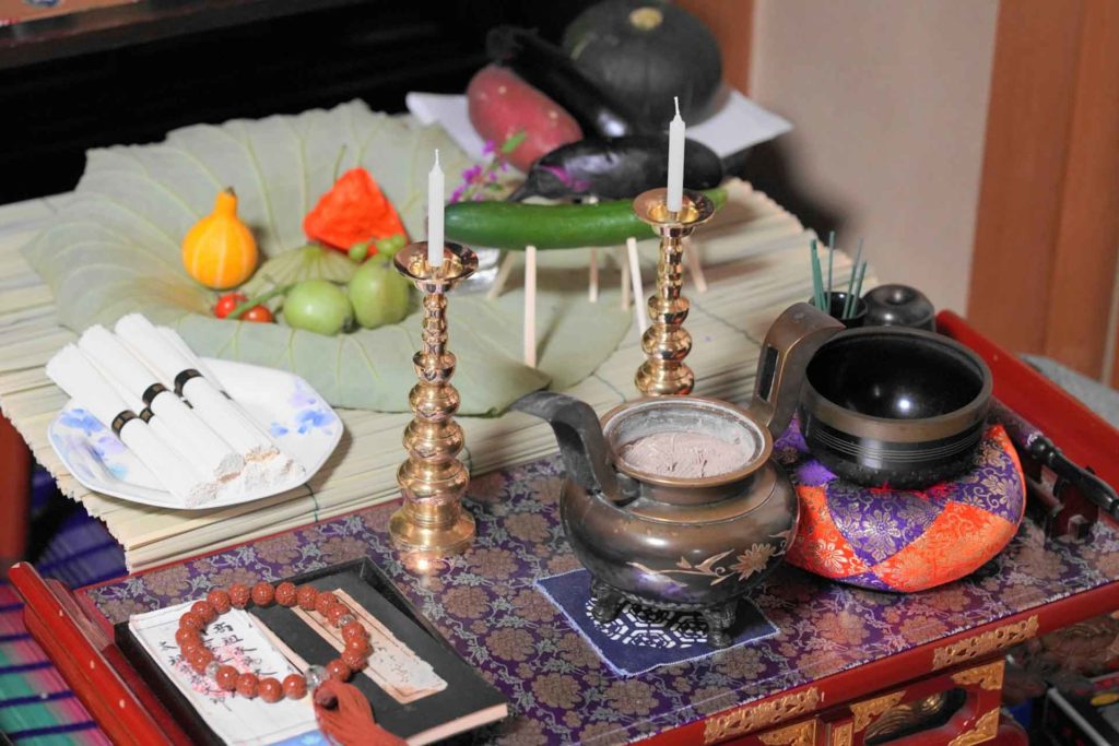 縄には、あわ、昆布、そうめん、ほおずき、みそはぎなどを吊るします。位牌を中央奥に安置し、その手前に香炉、花立て、燭台を置き、野菜や果物、精進料理を盛り付けた霊供膳(仏膳)などを供えます。